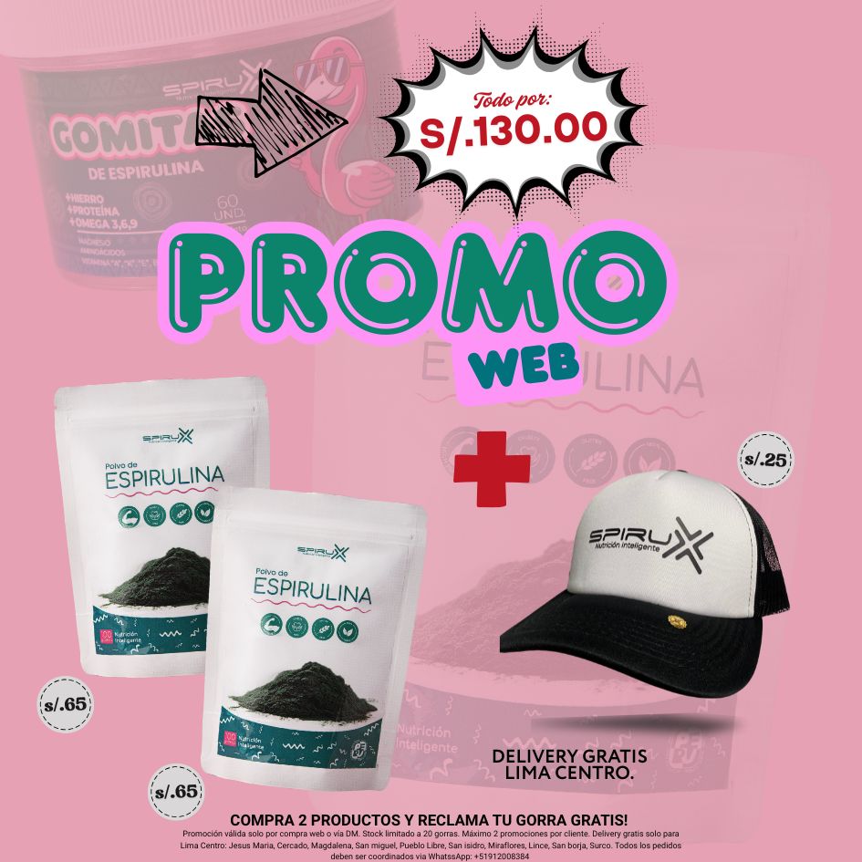 Llévate esta promo pensada para alimentar tu cuerpo con espirulina artesanal peruana de alta calidad. Incluye delivery gratis en Lima Centro y además te regalamos nuestra gorra edición limitada de SPIRUX para que te unas al team con estilo.